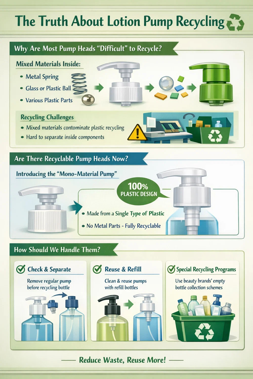 Cerca punti di riciclaggio specializzati: molti marchi di bellezza e cura della pelle ora offrono "programmi di riciclaggio di bottiglie vuote". Dispongono di canali specializzati per la gestione di queste complesse teste e imballaggi delle pompe, il che è molto più sicuro che gettarli semplicemente nel contenitore per il riciclaggio domestico.