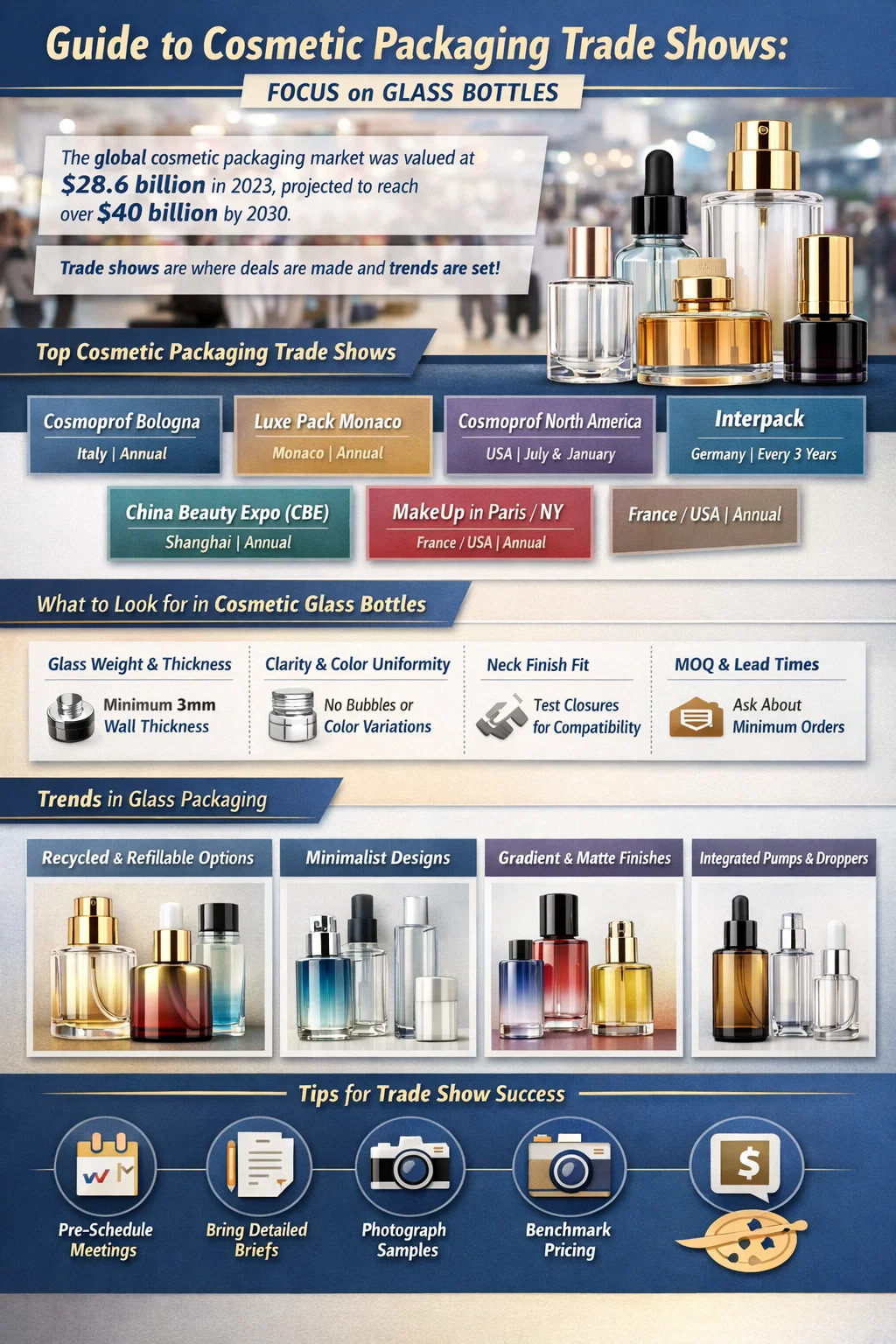 Se stai acquistando imballaggi per prodotti cosmetici, in particolare materiali di alta qualità come flaconi di vetro per cosmetici — partecipare alle fiere giuste è una delle decisioni più efficienti che puoi prendere. In un'unica sede, puoi confrontare centinaia di fornitori, gestire campioni fisici, negoziare direttamente i prezzi e costruire relazioni che richiedono mesi per essere replicate tramite e-mail. Il mercato globale del packaging cosmetico è stato valutato a circa 28,6 miliardi di dollari nel 2023 e si prevede che raggiungerà oltre 40 miliardi di dollari entro il 2030, secondo Grand View Research. Le fiere sono il luogo in cui prende forma una parte significativa di questo mercato: si stipulano accordi, si stabiliscono tendenze e si costruiscono reti di fornitori.