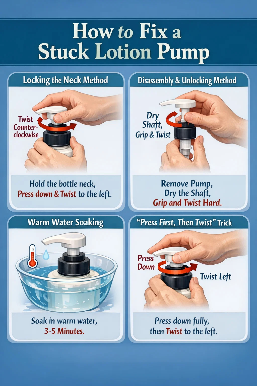 È abbastanza frustrante quando lo hai appena acquistato pompa per lozione non apparirà, non importa quanto lo giri. Di solito ciò accade perché il meccanismo di bloccaggio interno è troppo stretto o non lo stai ruotando nel modo giusto.