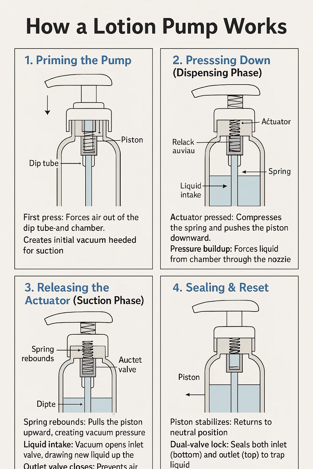 Aspirazione del liquido: il vuoto apre la valvola di ingresso, aspirando nuovo liquido nel tubo di immersione.