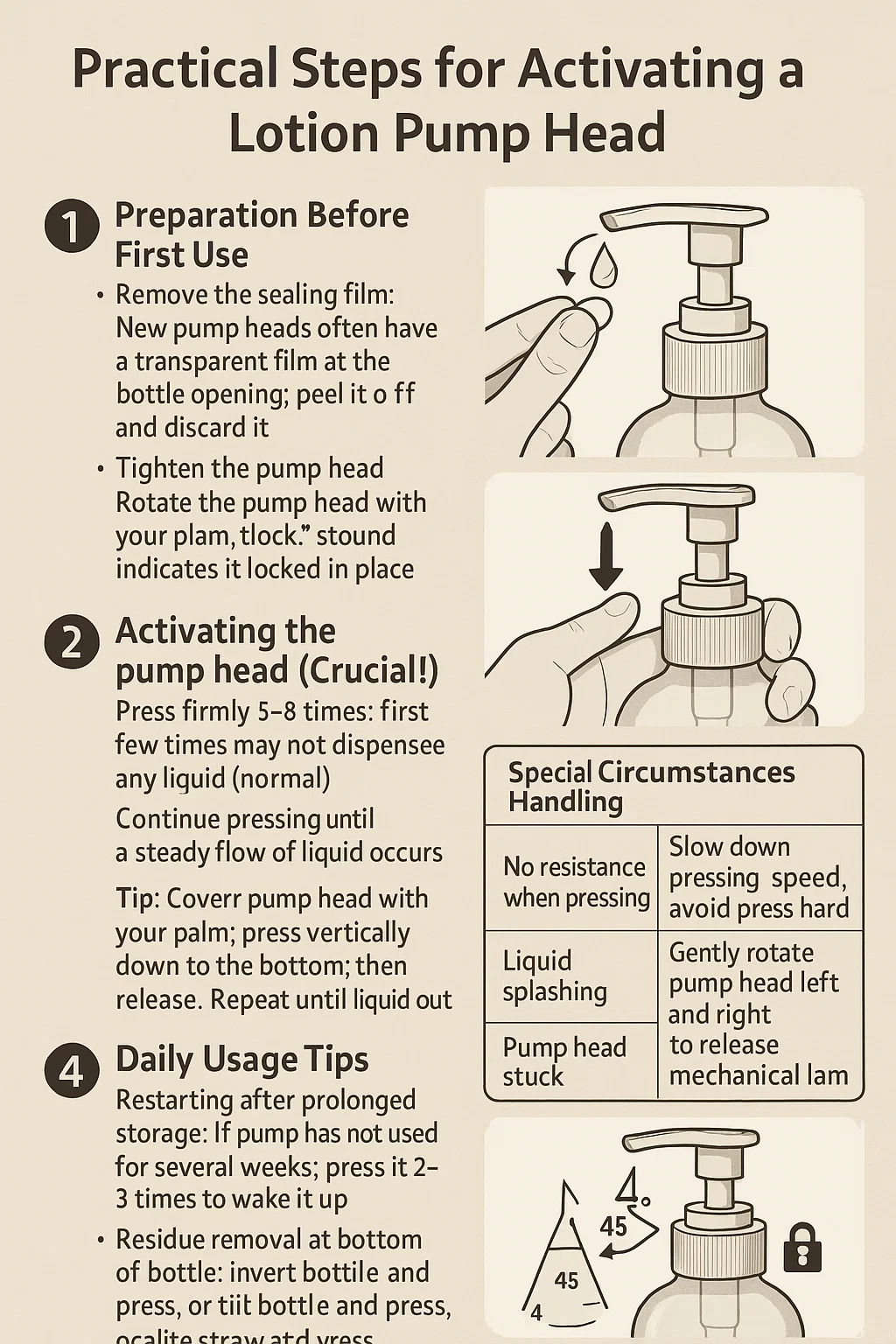 Suggerimento: coprire la testa della pompa con il palmo della mano, premere verticalmente verso il basso, quindi rilasciare. Ripetere finché il liquido non fuoriesce.