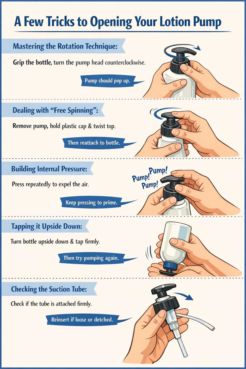 La cosa più frustrante dei prodotti per la cura della pelle appena acquistati è spesso la pompa della lozione che semplicemente non si muove. Infatti, queste teste della pompa sono progettate in fabbrica con uno speciale meccanismo di bloccaggio per evitare perdite.
