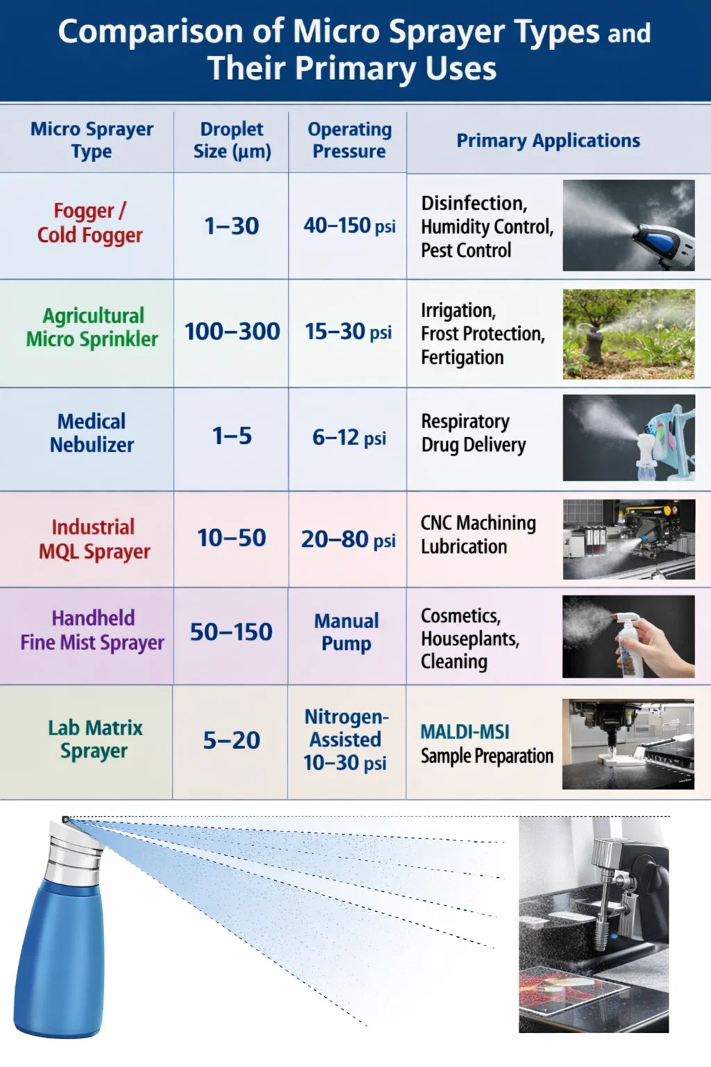 | Nebulizzatore / Nebulizzatore freddo | 1–30 | 40–150 PSI | Disinfezione, controllo dell'umidità, disinfestazione |