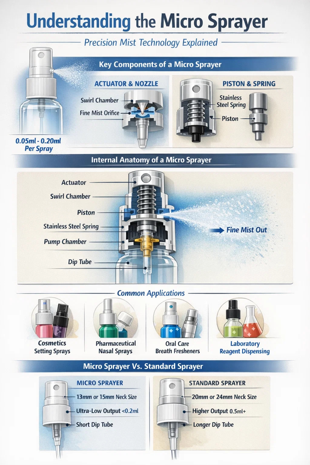 Per rispondere alla domanda "Che cos'è un micro spruzzatore?" , è un dispositivo di erogazione progettato con precisione progettato per convertire il liquido in una nebbia estremamente fine e uniforme con un volume di uscita molto basso per corsa. A differenza degli spruzzatori a pistola standard utilizzati per la pulizia domestica, a microspruzzatore in genere dispensa tra 0,05 ml e 0,20 ml di prodotto alla volta, rendendolo la scelta ideale per liquidi di alto valore dove il controllo del dosaggio e l'applicazione delicata sono fondamentali.